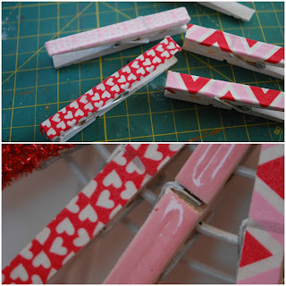 Step 5: Adding Washi tape to clothes pins: Using nine clothespins, secure the washi tape to the top surface of each clothespin and trim all edges to size to the top surface (lining up one edge of the washi tape to one side of the clothespin and trimming down the excess is a quick and easy method to this process).