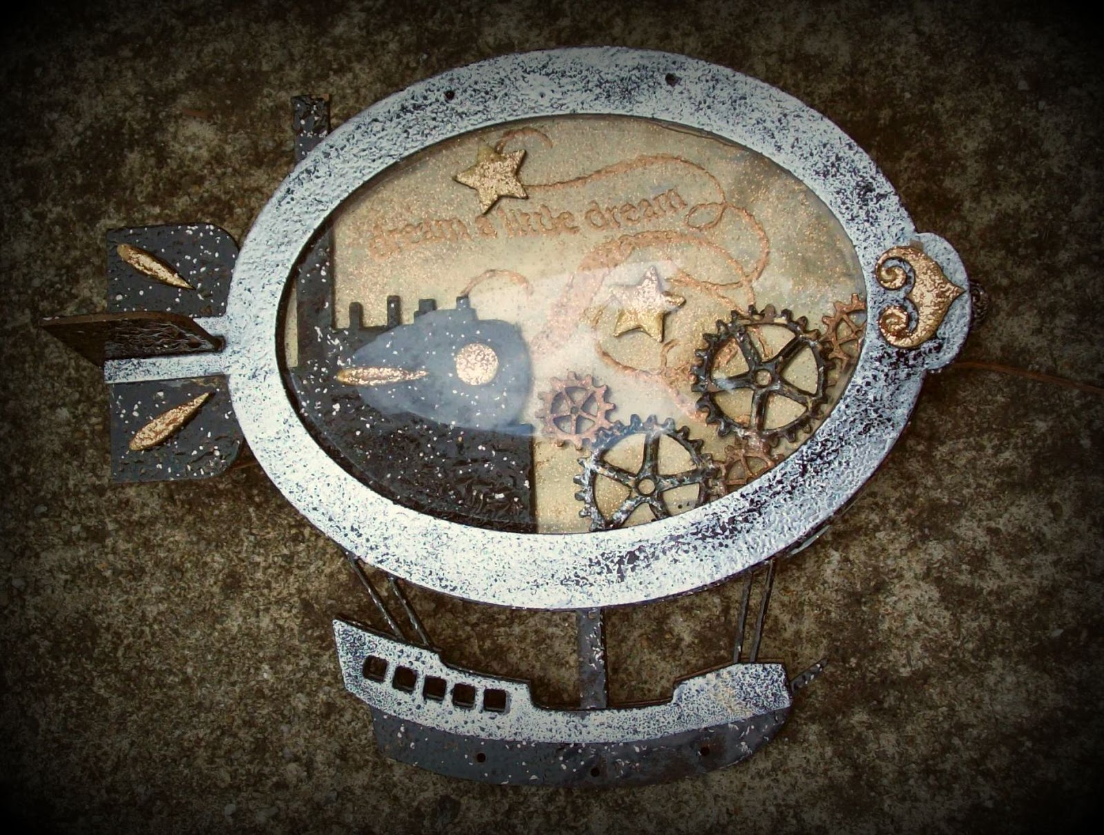 Emboss the remainder of the center piece of the Airship with Starry Sky Enamel. This is a great space color. Dark blues, blacks gold's, and silver tones.